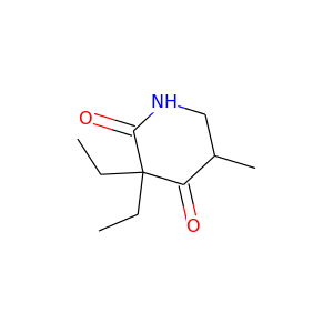 | synonyms | ['methyprylon', 'Noludar', 'Metiprilon', 'Metiprilone', 'Dimerin', 'Methyprylone', 'Noctan', 'Methyprolon', '125-64-4', 'Methprylon', 'Methyprylonum', 'Nodular', 'Metiprilona', '3,3-Diethyl-5-methylpiperidine-2,4-dione', '2,4-Dioxo-3,3-diethyl-5-methylpiperidine', '3,3-Diethyl-5-methyl-2,4-piperidinedione', 'Ro 1-6463', '2,4-Piperidinedione, 3,3-diethyl-5-methyl-', '2,4-Dioxy-3,3-diethyl-5-methylpiperidine', '3,3-Diethyl-2,4-dioxo-5-methylpiperidine', 'CUT48I42ON', 'NSC-30442', 'DTXSID7023306', 'NSC30442', '5,5-diethyl-6-hydroxy-3-methyl-2,3,4,5-tetrahydropyridin-4-one', 'RefChem:57766', 'DTXCID303306', 'N05CE02', '204-745-4', 'Methyprylon [INN]', 'Methyprylone [INN-French]', 'Methyprylonum [INN-Latin]', 'Metiprilona [INN-Spanish]', 'Methyprylon, (-)-', 'DEA No. 2575', 'NSC 30442', 'X66M7YN35V', 'Methyprylon, (+)-', 'UNII-X66M7YN35V', 'P66Z3UR32T', '2,4-Piperidinedione, 3,3-diethyl-5-methyl-, (-)-', '30590-01-3', '2,4-Piperidinedione, 3,3-diethyl-5-methyl-, (+)-', 'Methyprylon (1.0 mg/mL in Methanol)', '30590-00-2', 'Noludar (TN)', 'HSDB 3128', 'Methyprylon (JAN/INN)', 'EINECS 204-745-4', 'UNII-CUT48I42ON', 'BRN 0082860', 'Methyprylon [USP:INN:BAN]', 'METHYPRYLON [MI]', 'METHYPRYLON [JAN]', 'METHYPRYLON [HSDB]', 'METHYPRYLON [VANDF]', 'METHYPRYLON [MART.]', 'UNII-P66Z3UR32T', 'METHYPRYLON [WHO-DD]', 'SCHEMBL155838', '3,4-dioxo-5-methylpiperidine', '2, 3,3-diethyl-5-methyl-', 'GTPL7238', '2,3-diethyl-5-methylpiperidine', 'CHEMBL1200790', 'CHEBI:31837', 'METHYPRYLON [ORANGE BOOK]', 'Methyprylon (1 mg/mL in Methanol)', 'WLN: T6MV DVTJ C2 C2 E1', 'AKOS006239549', 'DB01107', 'NS00005672', 'D01150', 'Q409558'] |