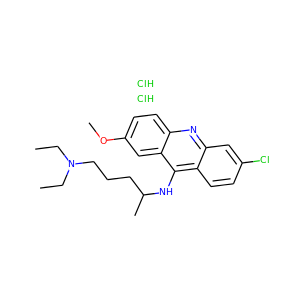 | synonyms | ['QUINACRINE DIHYDROCHLORIDE', '69-05-6', 'Mepacrine dihydrochloride', 'Chemiochin', 'Crinodora', 'Metoquin', 'Metoquine', 'Malaricida', 'Methoquine', 'Italchin', 'Metochin', 'Palacrin', 'Palusan', 'Pentilen', 'Mecryl', 'Chinacrin hydrochloride', '866 R.P.', 'chinacrin', '2-Chloro-5-(omega-diethylamino-alpha-methylbutylamino)-7-methoxyacridine dihydrochloride', 'Acridine, 6-chloro-9-((4-(diethylamino)-1-methylbutyl)amino)-2-methoxy-, dihydrochloride', 'RefChem:871914', 'Dihydrochloride, Quinacrine', 'Acrichin dihydrochloride', 'Quinacrine hydrochloride', 'Quinacrine 2HCl', 'Atebrine', 'Mepacrine hydrochloride', '2-Methoxy-6-chloro-9-(4-diethylamino-1-methylbutylamino)acridine dihydrochloride', 'Quinacrine hydrochloride anhydrous', 'Atabrine dihydrochloride', 'Atebrin hydrochloride', 'Quinacrine (dihydrochloride)', 'SN 390', '81A613ZZ6X', 'S.N. 390', '6-Chloro-9-((4-(diethylamino)-1-methylbutyl)amino)-2-methoxyacridine dihydrochloride', 'N4-(6-chloro-2-methoxyacridin-9-yl)-N1,N1-diethylpentane-1,4-diamine dihydrochloride', '6-Chloro-9-[[4-(diethylamino)-1-methylbutyl]amino]-2-methoxyacridine dihydrochloride', 'CCRIS 4709', 'NSC-14229', 'MEPACRINE HYDROCHLORIDE ANHYDROUS', 'C23H32Cl3N3O', 'EINECS 200-700-8', 'NSC 14229', 'UNII-81A613ZZ6X', 'SR-01000075643', 'Quinacrine diHCl', 'Giardiasis (TN)', 'intercalating agent', 'Mepacrine dihydrochloride;SN-390', 'MFCD00012659', '69-05-6 (HCl)', 'Quinacrine, Dihydrochloride', '3-Chloro-7-methoxy-9-(1-methyl-4-diethylaminobutylamino)acridine dihydrochloride', "3-Chloro-9-(4'-diethylamino-1'-methylbutylamino)-7-methoxyacridine dihydrochloride", 'SCHEMBL498442', 'SPECTRUM1500522', 'QUINACRINEDIHYDROCHLORIDE', 'CHEMBL554190', 'orb1310148', 'DTXSID6025985', 'SCHEMBL15061349', 'SCHEMBL30153780', 'GLXC-07831', 'HMS1920N16', 'HMS5082D20', 'HMS6019M04', 'HY-13735AR', 'GCA10041', 'GCA10042', 'Quinacrine dihydrochloride, >=90%', 'Tox21_500970', 'CCG-39896', 'HY-13735A', 's4255', 'SBB057768', 'AKOS005111333', 'CS-4590', 'FC76313', 'KH-0002', 'LP00970', '1,4-Pentanediamine, N4-(6-chloro-2-methoxy-9-acridinyl)-N1,N1-diethyl-, dihydrochloride', 'MEPACRINE HYDROCHLORIDE [WHO-DD]', 'Quinacrine (dihydrochloride) (Standard)', 'NCGC00094270-01', 'NCGC00094270-02', 'NCGC00094270-03', 'NCGC00261655-01', 'ANHYDROUS MEPACRINE DIHYDROCHLORIDE', 'DB-055218', 'EU-0100970', 'Q0056', 'SW196810-3', 'D02548', 'H12040', 'Q 3251', 'SR-01000075643-1', 'Q27269238', '{4-[(6-chloro-2-methoxyacridin-9-yl)amino]pentyl}diethylamine, chloride, chlor ide', '4-N-(6-chloro-2-methoxyacridin-9-yl)-1-N,1-N-diethylpentane-1,4-diamine;dihydrochloride', '6-Chloro-9-(4-diethylamino-1-methylbutyl)amino-2-methoxyacridine Dihydrochloride', '6-chloro-N-[5-(diethylamino)pentan-2-yl]-2-methoxyacridin-9-amine dihydrochloride', 'N4-(6-chloro-2-methoxy-acridin-9-yl)-N1,N1-diethyl-pentane-1,4-diamine;dihydrochloride', '(+/-)-6-CHLORO-9-((4-(DIETHYLAMINO)-1-METHYLBUTYL)AMINO)-2-METHOXYACRIDINE DIHYDROCHLORIDE', 'N~4~-(6-chloro-2-methoxyacridin-9-yl)-N~1~,N~1~-diethylpentane-1,4-diamine dihydrochloride', 'N~4~-(6-Chloro-2-methoxyacridin-9-yl)-N~1~,N~1~-diethylpentane-1,4-diamine--hydrogen chloride (1/2)'] |
