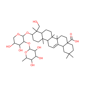 | InChI | InChI=1S/C41H66O12/c1-21-28(44)30(46)31(47)33(51-21)53-32-29(45)24(43)19-50-34(32)52-27-11-12-37(4)25(38(27,5)20-42)10-13-40(7)26(37)9-8-22-23-18-36(2,3)14-16-41(23,35(48)49)17-15-39(22,40)6/h8,21,23-34,42-47H,9-20H2,1-7H3,(H,48,49)/t21-,23-,24-,25+,26+,27-,28-,29-,30+,31+,32+,33-,34-,37-,38-,39+,40+,41-/m0/s1 |