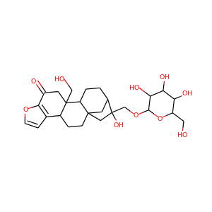 | InChI | InChI=1S/C26H36O10/c27-9-17-19(30)20(31)21(32)23(36-17)35-12-26(33)10-24-5-3-15-14-4-6-34-22(14)16(29)8-25(15,11-28)18(24)2-1-13(26)7-24/h4,6,13,15,17-21,23,27-28,30-33H,1-3,5,7-12H2 |