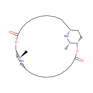 | InChI | InChI=1S/C28H50N2O4/c1-21-25-19-17-23(29-21)13-9-5-3-8-12-16-28(32)34-26-20-18-24(30-22(26)2)14-10-6-4-7-11-15-27(31)33-25/h21-26,29-30H,3-20H2,1-2H3/t21-,22-,23+,24+,25-,26-/m0/s1 |