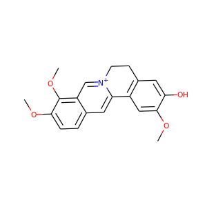 | synonyms | ['Jatrorrhizine', '3621-38-3', '2,9,10-trimethoxy-5,6-dihydroisoquinolino[2,1-b]isoquinolin-7-ium-3-ol', '091S1F8V5Q', 'DTXSID40189767', '2,9,10-trimethoxy-5,6-dihydroisoquinolino(2,1-b)isoquinolin-7-ium-3-ol', 'RefChem:792518', 'DTXCID00112258', '2,9,10-trimethoxy-6,7-dihydro-5H-isoquinolino(2,1-b)isoquinolin-7-ium-3-one', '222-817-3', 'jateorrhizine', 'neprotin', 'Yatrorizine', '3-Hydroxy-2,9,10-trimethoxy-5,6-dihydroisoquinolino[3,2-a]isoquinolin-7-ium', 'MFCD01310242', '7,8,13,13a-tetradehydro-3-hydroxy-2,9,10-trimethoxyberbinium', 'CHEMBL251055', 'GNF-PF-220', '5,6-Dihydro-3-hydroxy-2,9,10-trimethoxydibenzo[a,g]quinolizinium', '3-Hydroxy-2,9,10-trimethoxy-5,6-dihydroisoquinolino-[3,2-a]isoquinolin-7-ium', 'Neprotine', 'NSC150445', 'NSC209410', 'NSC645313', 'Jatrochizine', 'Jatrorhizine', 'Jatrorrhizine?', 'UNII-091S1F8V5Q', '5,6-DIHYDRO-3-HYDROXY-2,9,10-TRIMETHOXYDIBENZO(A,G)QUINOLIZINIUM', 'Dibenzo[a,g]quinolizinium, 5,6-dihydro-3-hydroxy-2,9,10-trimethoxy-', 'EINECS 222-817-3', 'Jatrorrhizine (Neprotine)', 'JATRORRHIZINE [MI]', 'MLS000563433', 'SCHEMBL564128', 'CHEBI:6087', 'MEGxp0_001765', 'orb1303544', 'SCHEMBL29368316', 'SCHEMBL29381269', 'HMS2224L17', 'HMS3354I18', 'HMS3885O10', 'HY-N0749', 'MSK40301', 'BDBM50226670', 's3884', 'AKOS015896759', 'CCG-267897', 'NCGC00247622-01', 'FJ178068', 'NCI60_042074', 'SMR000232285', 'DB-050230', 'CS-0009780', 'NS00029996', '2,9,10-trimethoxy-3-hydroxyl-protoberberine', 'C09553', 'AE-508/21133010', 'AE-508/21133011', 'AL-466/21199009', 'Q10910369', '7,8,13,13a-tetrahydro-3-hydroxy-2,9,10-trimethoxyberbinium', '5,6-dihydro-3-hydroxy-2,9,10-trimethoxy-dibenzo[a,g]quinolizinium', '7,8,13,13|A-Tetradehydro-3-hydroxy-2,9,10-trimethoxyberbinium', '7,8,13,13alpha-Tetradehydro-3-hydroxy-2,9,10-trimethoxyberbinium', '2,9,10-trimethoxy-5,6-dihydroisoquinolino[3,2-a]isoquinolin-7-ium-3-ol', 'Berbinium, 7,8,13,13a-tetradehydro-3-hydroxy-2,9,10-trimethoxy- (8CI)', '2,9,10-Trimethoxy-5,6-dihydro-7lambda~5~-isoquino[3,2-a]isoquinolin-3-ol hydrochloride'] |