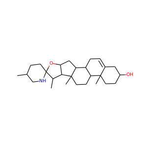 | synonyms | ['solasodine', '126-17-0', 'Purapuridine', 'Solanidine-S', 'Solancarpidine', 'Solasodin', 'Solasod-5-en-3beta-ol', 'L40Y453Y96', 'Salasodine', 'Salasdine', 'CHEBI:9190', '(3beta,22alpha,25R)-spirosol-5-en-3-ol', 'DTXSID101030558', 'NSC-178260', 'Spirosol-5-en-3-ol, (3beta,22alpha,25R)-', 'delta5-20Betaf,22alphaf,25alphaf,27-azaspirosten-3beta-ol', 'NSC-179187', "(1S,2S,4S,5'R,6R,7S,8R,9S,12S,13R,16S)-5',7,9,13-tetramethylspiro[5-oxapentacyclo[10.8.0.02,9.04,8.013,18]icos-18-ene-6,2'-piperidine]-16-ol", "(1S,2S,4S,5'R,6R,7S,8R,9S,12S,13R,16S)-5',7,9,13-tetramethylspiro(5-oxapentacyclo(10.8.0.02,9.04,8.013,18)icos-18-ene-6,2'-piperidine)-16-ol", 'RefChem:184222', 'DTXCID901515643', '204-774-2', "5',7,9,13-tetramethylspiro(5-oxapentacyclo(10.8.0.02,9.04,8.013,18)icos-18-ene-6,2'-piperidine)-16-ol", '(22R,25R)-spirosol-5-en-3beta-ol', 'MFCD00037844', "(4S,5'R,6aR,6bS,8aS,8bR,9S,10R,11aS,12aS,12bS)-5',6a,8a,9-Tetramethyl-1,3,4,5,6,6a,6b,7,8,8a,8b,9,11a,12,12a,12b-hexadecahydrospiro[naphtho[2',1':4,5]indeno[2,1-b]furan-10,2'-piperidin]-4-ol", 'NSC178260', 'Solasod-5-en-3-beta-ol', 'Solancarpine', 'Spirosol-5-en-3-ol, (3.beta.,22.alpha.,25R)-', 'Solanearpidine', '(-)-Solasodine', 'NSC 179187', 'Solasod-5-en-3.beta.-ol', 'SR-01000814832', 'Solancarpidine;', 'Purapuridine;', 'Purapuridine;Solancarpidine;Solasodin', 'Solanidine S;', 'NSC 178260', 'SOLASADINE', 'SOLASODINE [MI]', 'Prestwick3_000663', 'SOLASODINE [WHO-DD]', 'BSPBio_000725', 'MLS001164064', 'SCHEMBL456185', 'BPBio1_000799', 'CHEMBL518252', 'orb1303271', 'Solasodine - Bio-X trade mark', 'UNII-L40Y453Y96', 'HSDB 3538', 'MSK3003', 'KWVISVAMQJWJSZ-VKROHFNGSA-N', 'HMS2097E07', 'HMS2862C06', 'HY-N0068', 'EINECS 204-774-2', 'AKOS015969707', 'CS-1651', 'EBC-618395', 'OS73940', 'BRN 0094578', 'NCGC00179461-01', '(25R)-22alpha-spirosol-5-en-3beta-ol', 'BS300158', 'SMR000539436', 'SY231499', 'AB00513879', 'NS00041398', '4-27-00-02000 (Beilstein Handbook Reference)', 'Q740439', 'SR-01000814832-3', 'SR-01000814832-4', "(2R,5'R)-5'-tetramethylspiro[[?]-2,2'-piperidine]ol", '(3.BETA.,22.ALPHA.,25R)-SPIROSOL-5-EN-3-OL', "(1S,2S,4S,5'R,6R,7S,8R,9S,12S,13R,16S)-5',7,9,13-tetramethyl-5-oxaspiro[pentacyclo[10.8.0.0^{2,9}.0^{4,8}.0^{13,18}]icosane-6,2'-piperidin]-18-en-16-ol", "(2'R,4S,5'R,6aR,6bS,8aS,8bR,9S,11aS,12aS,12bS)-5',6a,8a,9-tetramethyl-1,3,4,5,6,6a,6b,7,8,8a,8b,9,11a,12,12a,12b-hexadecahydrospiro[naphtho[2',1':4,5]indeno[2,1-b]furan-10,2'-piperidin]-4-ol", "(2S,2'R,4aR,4bS,5'R,6aS,6bR,7S,9aS,10aS,10bS)-4a,5',6a,7-tetramethyl-1,2,3,4,4a,4b,5,6,6a,6b,7,9a,10,10a,10b,11-hexadecahydrospiro[naphtho[2',1':4,5]indeno[2,1-b]furan-8,2'-piperidin]-2-ol"] |
